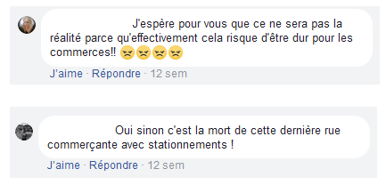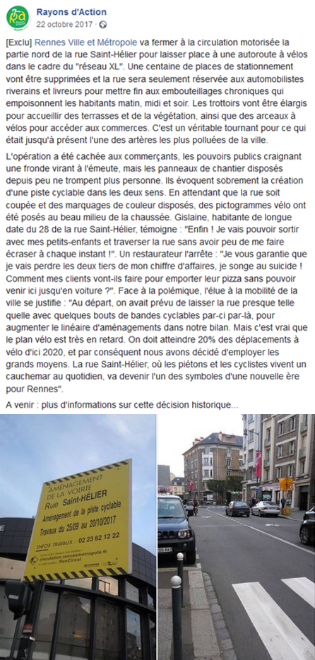 Les politiques d’apaisement ne sont en général pas du goût des commerçants. Pour exemple, les commentaires laissés sur ce post Facebook de l’association des usagers du vélo à Rennes, Rayons d’Action, annonçant la future fermeture à la circulation motorisée d’une artère du centre-ville. L’information, fausse, visait à faire réagir.
